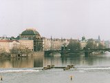 カレル橋上には様々な土産物屋や絵を書いたり音楽を奏でたり人々、観光客が入り乱れ賑やか。橋に並ぶ聖人の像を見ながらモルダウ川(Vltava)を渡る。